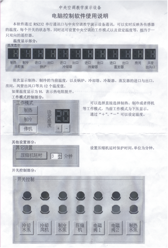 為了更好地滿足各大院校的教學(xué)需要,在原來開發(fā)的中央空調(diào)實驗設(shè)備的基礎(chǔ)上,配備了RS-232串行通訊接口,可直接與電腦連接,由電腦控制軟件控制整個實驗臺的運行,包括:總控臺啟動、制冷、制熱、冷卻水泵、冷卻風機、制冷水泵、壓縮機、電磁閥、制熱水泵做演示,制冷、制熱的溫度設(shè)定等。