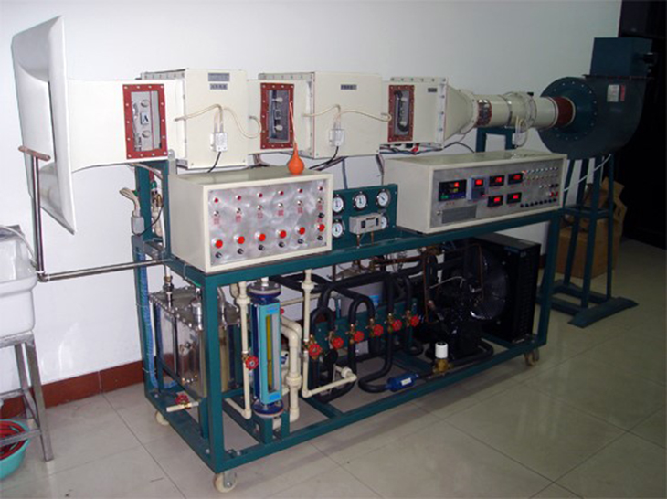 本裝置集直流空調(diào),制冷壓縮機(jī)性能,制冷熱泵,表冷器性能,加熱器性能于一體,可進(jìn)行空氣的加熱,加濕,冷卻,干燥,蒸發(fā)器,冷凝器進(jìn)行換相,可測出各點(diǎn)溫度、濕度、壓力、風(fēng)量、水流量及功率,計(jì)算出制冷量、功率、制冷系數(shù)、效率、并進(jìn)行熱平衡計(jì)算。