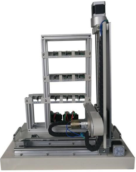 模型包含三層九倉位庫體、出/入庫倉位庫體、三維(X、YZ)運(yùn)動機(jī)械及電氣控制等部分組成;定位執(zhí)行機(jī)構(gòu)由豎軸和橫軸組成;驅(qū)動機(jī)構(gòu)由步進(jìn)電機(jī)及步進(jìn)電機(jī)驅(qū)動器組成;傳動軸為滾珠絲桿傳動和雙軸導(dǎo)軌帶傳動,傳動平穩(wěn)。取物軸由直流減速電機(jī)驅(qū)動,可實現(xiàn)前后兩方向的運(yùn)動。