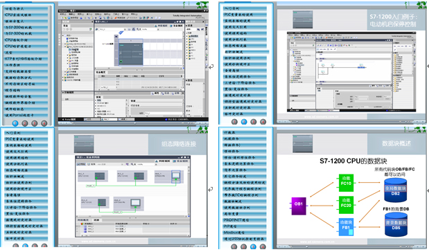 配有S7-1200 PLC學(xué)習(xí)軟件,方便老師教學(xué),提供有功能與特點、模塊安裝、選型、工作原理、支持的數(shù)據(jù)類型、數(shù)據(jù)的存取方式、程序結(jié)構(gòu)、編程軟件的安裝、編程軟件界面介紹、硬件的組態(tài)、入門實例、PLC變量表的使用、使用交叉引用、組織塊使用示例、基本位邏輯指令、上升沿-下降沿指令、置位-復(fù)位指令、接通延時定時器、比較指令、移位-循環(huán)移位指令、基本邏輯運(yùn)算指令、數(shù)據(jù)塊概述等50多個學(xué)習(xí)項目。PLC學(xué)習(xí)軟件參考界面如下: