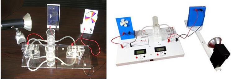 燃料電池教具是利用光線照射在太陽(yáng)能電池板上產(chǎn)生電能,然后利用產(chǎn)生的電能作用在電解電池模塊上,使水發(fā)生電解產(chǎn)生氫氣和氧氣。氫氣和氧氣進(jìn)入到發(fā)電模塊產(chǎn)生電能,帶動(dòng)風(fēng)扇轉(zhuǎn)動(dòng)。