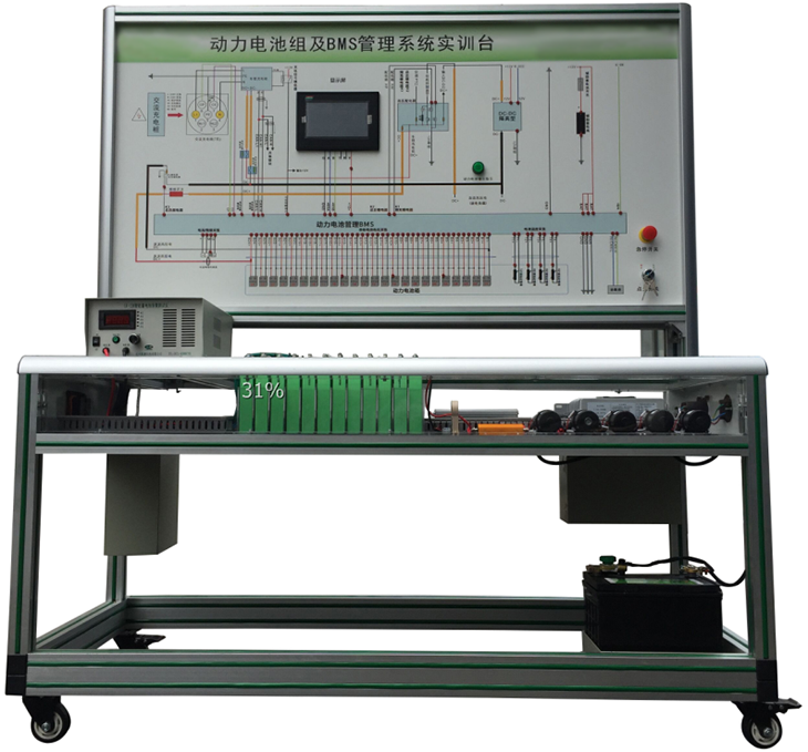 磷酸鐵鋰動力電池包與鐵制電池箱(單體電池3.2V 20AH,24串)、BMS鋰電管理一體機、動力電池包觸摸顯示屏、車載充電機、國標充電插口、國標充電槍、緊急斷電開關、霍爾電流傳感器、直流接觸器(包含充電繼電器、總正繼電器、總負繼電器、預充繼電器)、DC-DC轉換器(72V-12V30A)、輔助蓄電池(12V45AH)、放電控制繼電器與放電負載電阻、預充電阻器、可移動實訓臺(1500×700×1700mm 帶自鎖腳輪裝置,帶安裝檢測端子的原理面板,面板1448×940mm)、故障模擬與排除裝置、設備操作說明書。