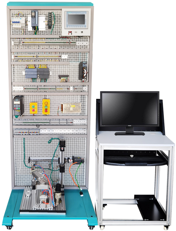 只萬向輪(2 只帶剎車)?蓪 PLC、電源、變頻器、觸摸屏等安放在該平臺上,配有空氣開關、接線端子、電纜線、輔料,接地可靠,設有漏電等保護裝置,安全性符合相關的國標標準,保護學生在實訓過程中的安全性。采用工業(yè)規(guī)范制作,所有接線有標號,便于實訓和日常維護。