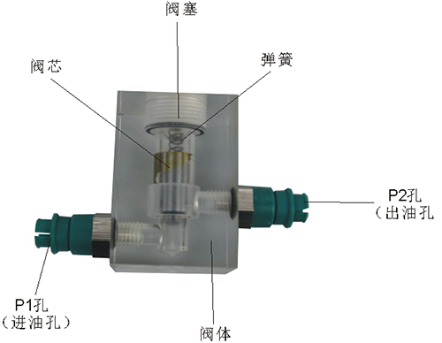 2、溢流閥結(jié)構(gòu)上參考了國(guó)產(chǎn)P-63B型低壓直動(dòng)式溢流閥,其閥體閥蓋、鎖緊螺母、調(diào)節(jié)螺母、螺塞等采用了進(jìn)口透明有機(jī)玻璃材料精制而成,閥芯、調(diào)節(jié)桿采用了45#中碳鋼材料。并配合彈簧,油接頭,密封圈等標(biāo)準(zhǔn)件裝配而成,通過它可明確地觀察到閥芯、彈簧、油孔等結(jié)構(gòu)及其運(yùn)行過程,具有形象逼真,性能可靠等優(yōu)點(diǎn)。它即可作為教學(xué)模型,也可以作為液壓實(shí)驗(yàn)元件進(jìn)行實(shí)驗(yàn)演示。